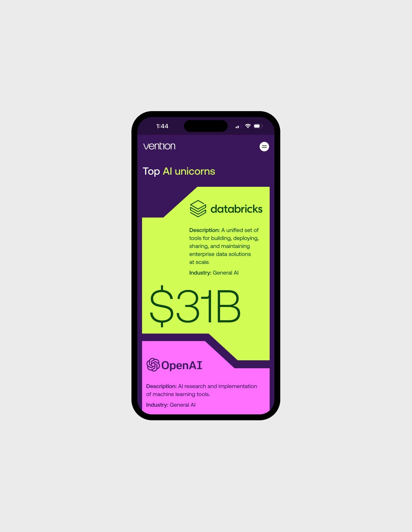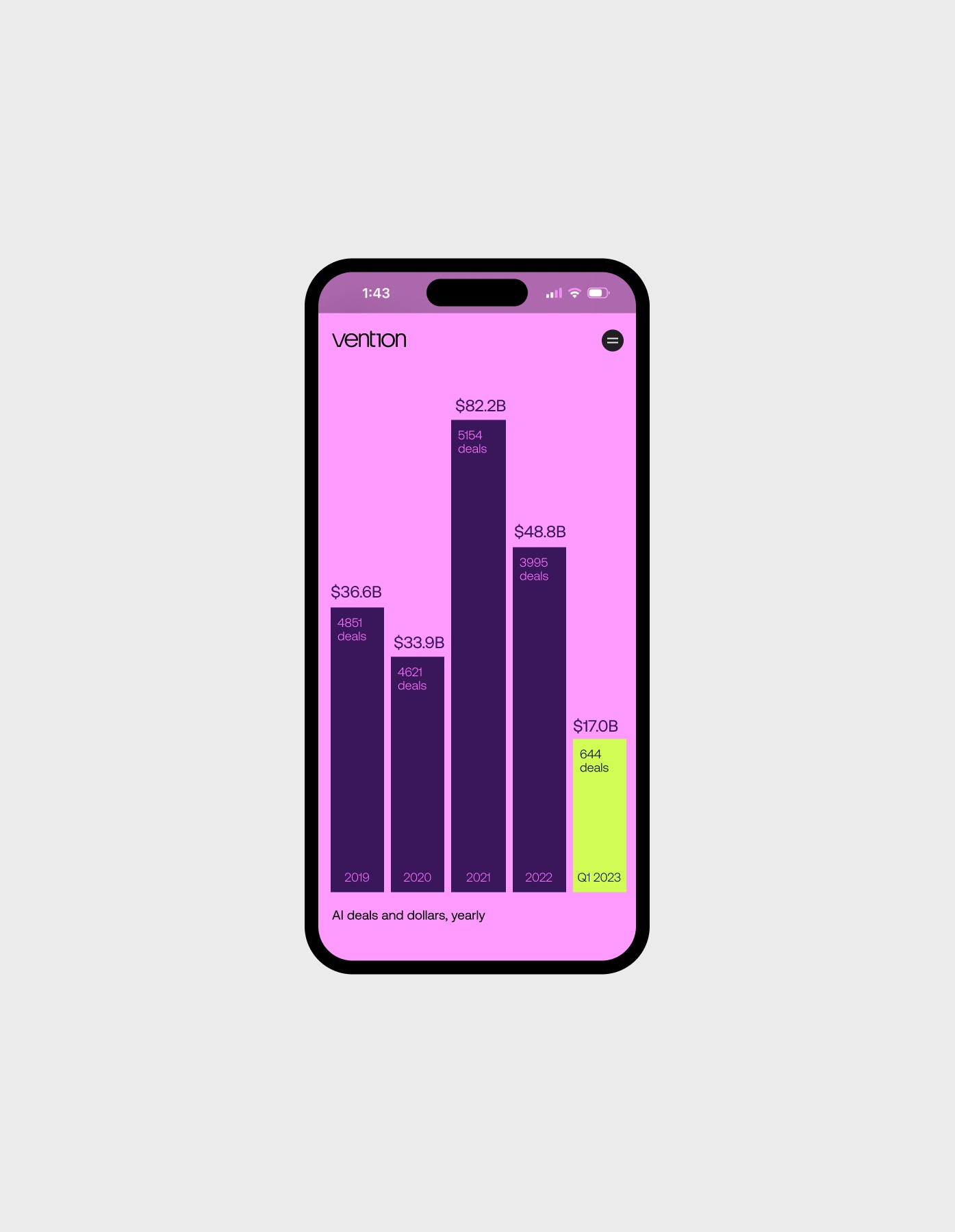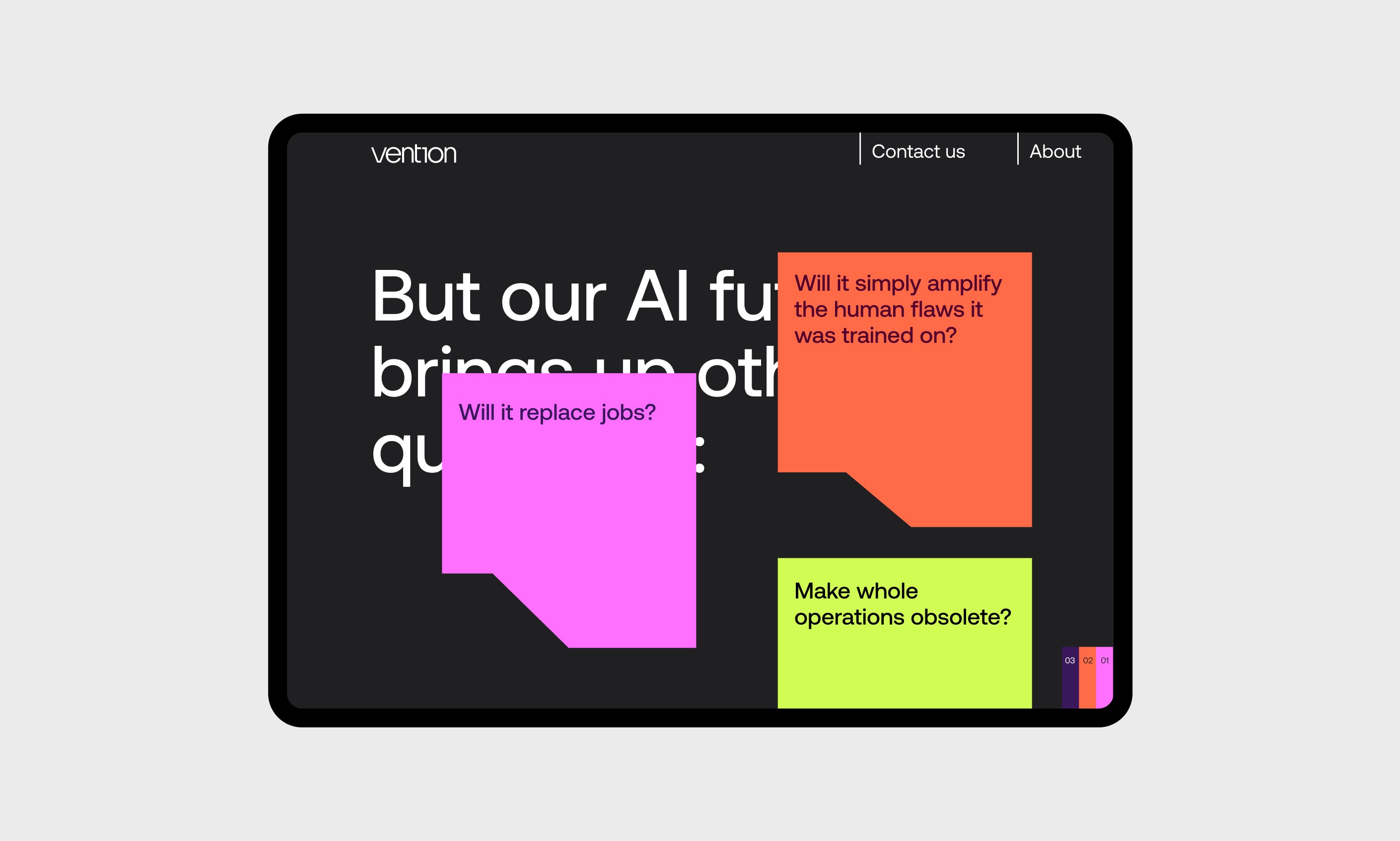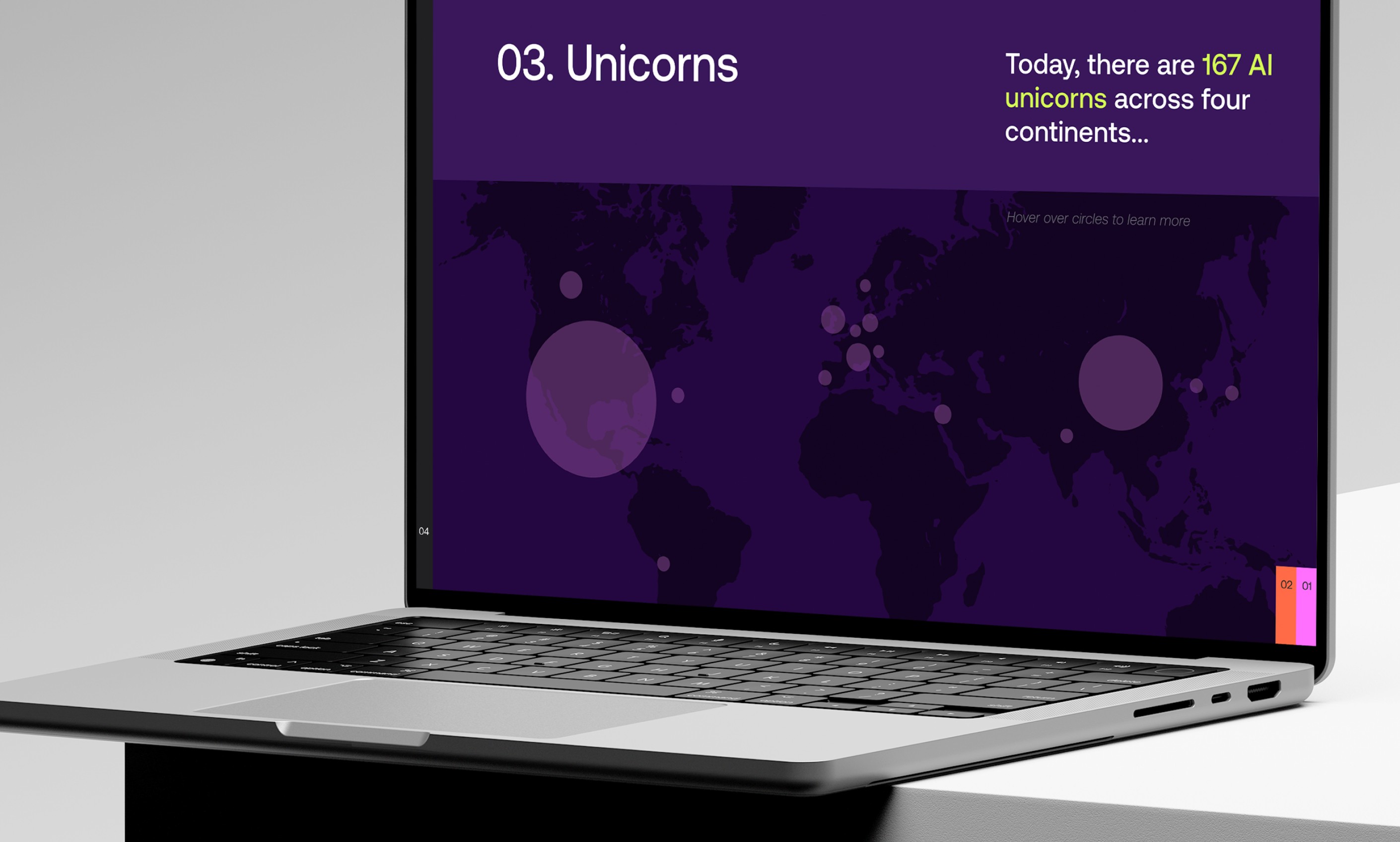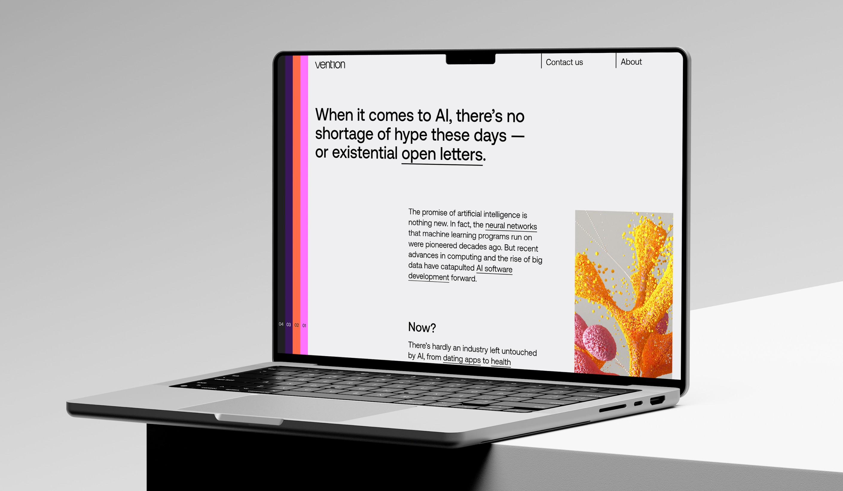 The report narrative inspired a visual identity centered on AI’s ever-evolving landscape. We developed a dynamic layout with visuals and transitions that reflected the field’s rapid expansion. While using Vention’s brand colors, we opted for bolder combinations to reflect the topic's saturation. Every detail — from the opening animation to the interactive 'guess which' challenge — was designed to keep readers engaged and immersed.